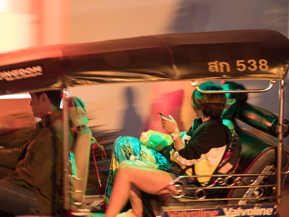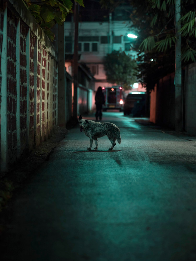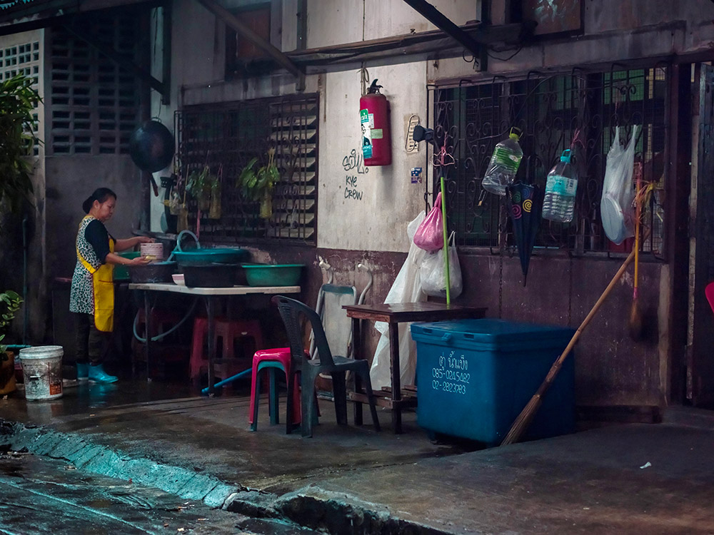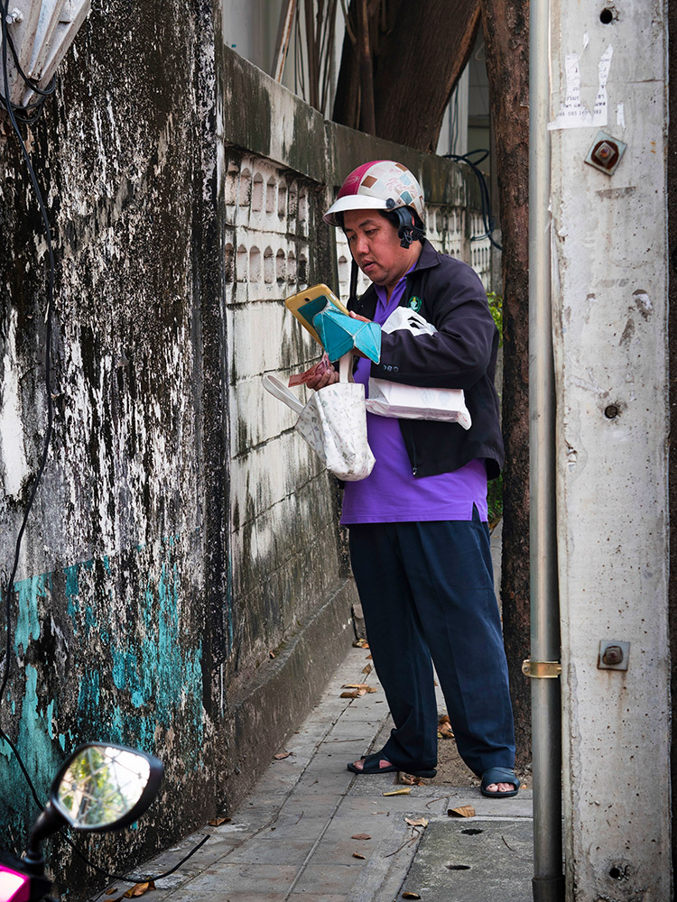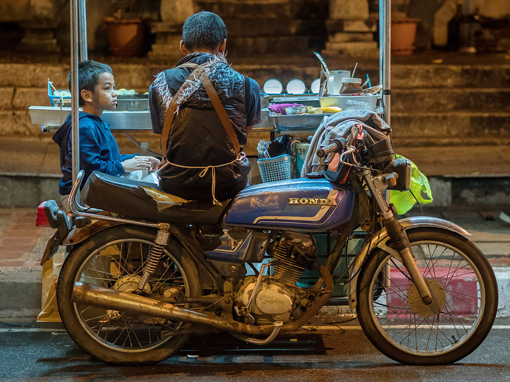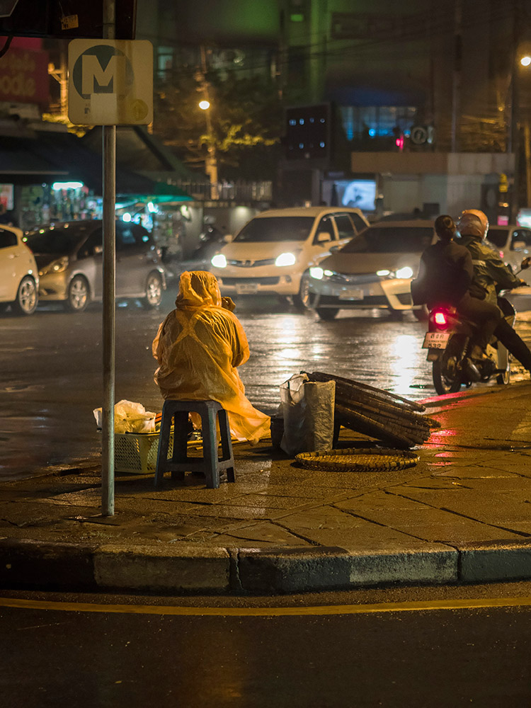 La Thaïlande foisonne de lieux propices à la photographie de rue. Vendeurs ambulants, travailleurs nocturnes, livreurs à moto. Le climat changeant offre aussi de belles sources de lumières en fonction de l'heure de la journée. La pluie invente par ses reflets sur le bitume des palettes de couleurs scintillantes. La nuit, les petits stands ambulants éclairés à la lumière blanche produisent l'effet d'un décors de théâtre, laissant ainsi chacun jouer son rôle, celui de sa vie. Parfois même, le temps semble s'être arrêté pour reprendre son souffle.