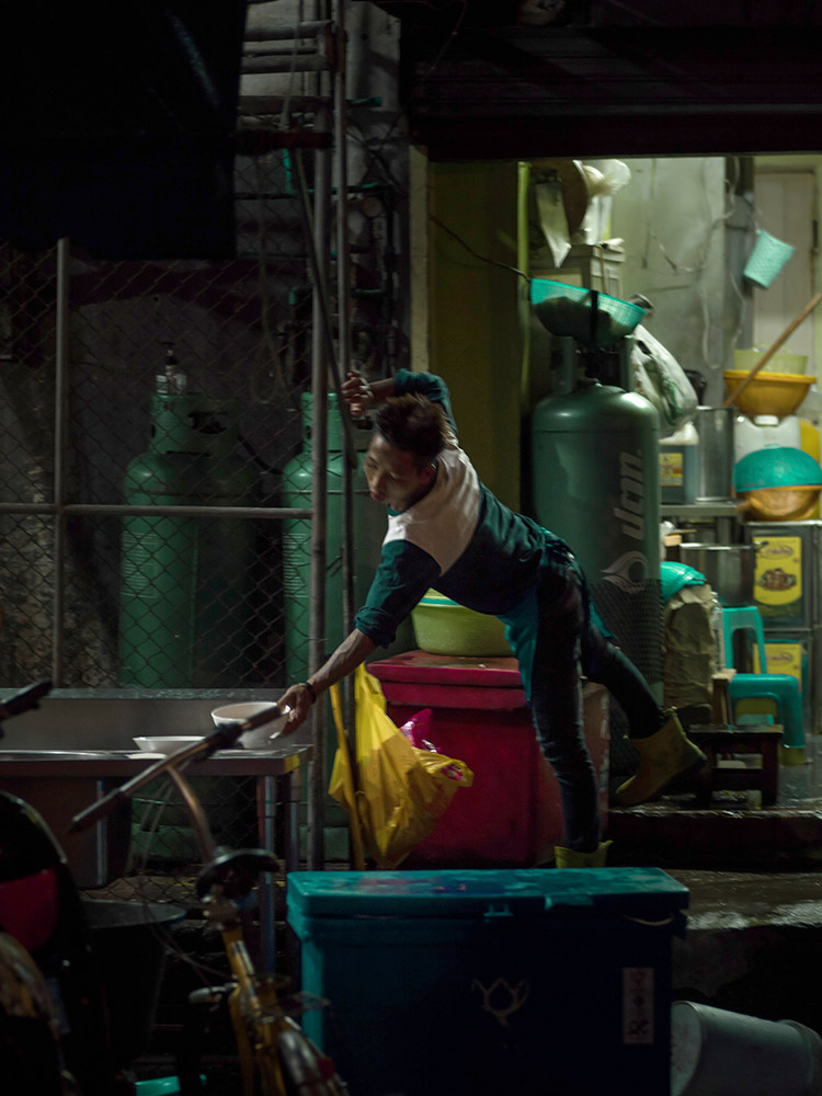 La Thaïlande foisonne de lieux propices à la photographie de rue. Vendeurs ambulants, travailleurs nocturnes, livreurs à moto. Le climat changeant offre aussi de belles sources de lumières en fonction de l'heure de la journée. La pluie invente par ses reflets sur le bitume des palettes de couleurs scintillantes. La nuit, les petits stands ambulants éclairés à la lumière blanche produisent l'effet d'un décors de théâtre, laissant ainsi chacun jouer son rôle, celui de sa vie. Parfois même, le temps semble s'être arrêté pour reprendre son souffle.
